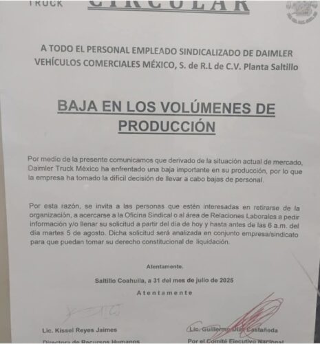 La planta de Daimler Vehículos Comerciales México, ubicada en Saltillo, enfrenta una reducción en su producción, motivo por el cual ha iniciado un proceso de bajas voluntarias dirigido a sus trabajadores sindicalizados. Esta decisión busca hacer frente al menor volumen de trabajo y mantener la estabilidad operativa de la compañía.
